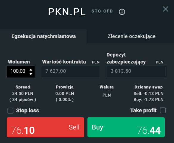 Na obrazku, przykład kontraktu CFD na akcje Orlenu. Sell – to zajęcie pozycji krótkiej czyli próba zarobienia w przypadku spadku ceny. Natomiast Buy to pozycja długa z chęcią zysku w przypadku wzrostu notowań.